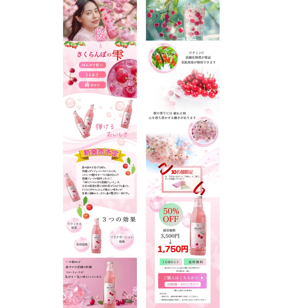 - さくらんぼと桜の飲料水の特長や製法、使用されている素材の詳細をわかりやすく紹介しています。品質にこだわりを持っていることを明確に伝えています。